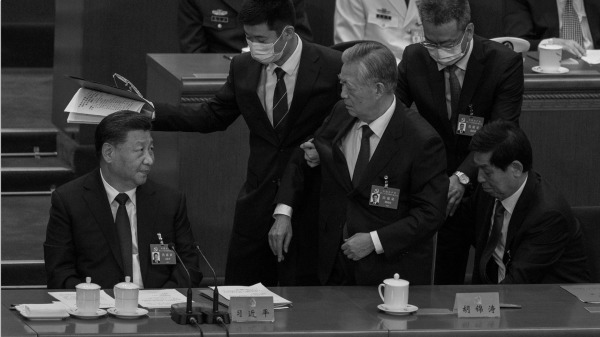 中共二十大闭幕式上,胡锦涛被工作人员带离会场。 (图片来源:Lintao Zhang/Getty Images)