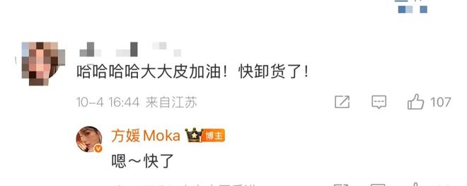 有网友评论“快卸货了”,方媛回应“嗯~快了”。