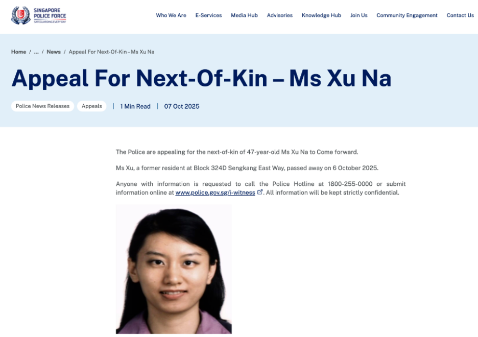 新加坡警察部队呼吁寻找徐娜的亲属,可以尽快联系警方。