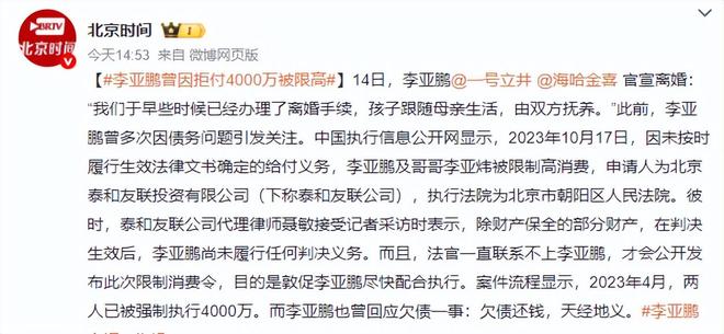 事实也的确如此,根据媒体的报道可知,因为投资、创业亏损,李亚鹏有4.6亿关联债以及4000万的个人对赌债。
