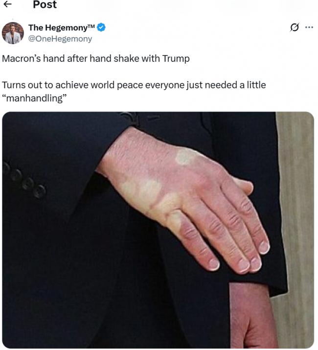 川普與馬克龍過去多次上演怪異的握手場面,最知名莫過於2017年,當時馬克龍緊握川普的手不放,川普試圖掙脫未果,相握29秒之久。2018年兩人在七大工業國集團(G7)峰會再會,多次握手,其中一次馬克龍在川普手背留下指印。這兩次畫面在網絡廣傳至今。