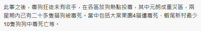 元朗则成为了下毒事件的重灾区,两星期内有竟20多只猫狗被毒死!