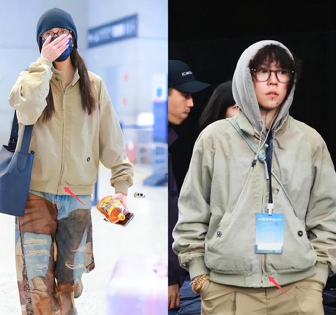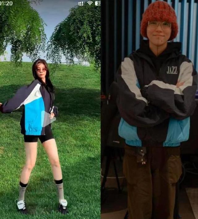 她们穿过同一件工装夹克、黑色羽绒服、蓝白条拼色运动上衣。