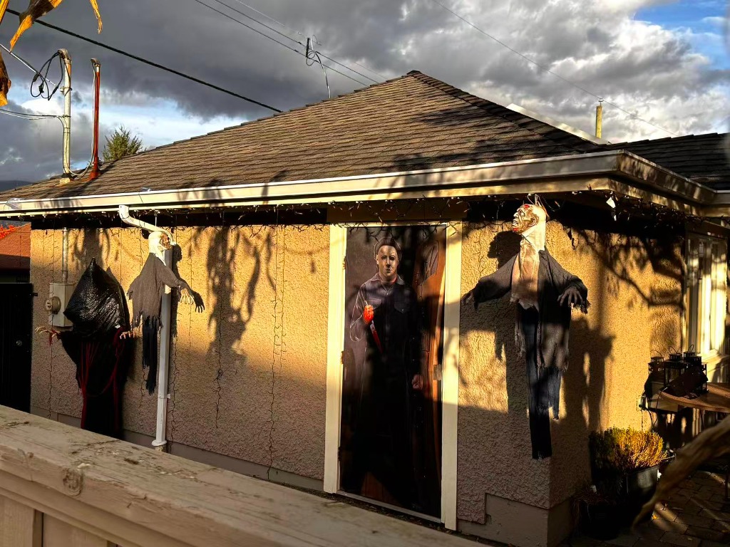 就连后院的杂物房的门口都是万圣节经典电影《月光光心慌慌》(Halloween)的戴着面具、冷血无情的杀人狂迈克尔·迈尔斯 (Michael Myers) 的画像,你说惊不惊!