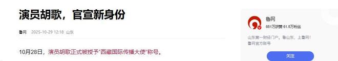 据中国西藏网报道,10月28日,在中国西藏发展论坛期间,胡歌受聘为首位西藏国际传播大使。