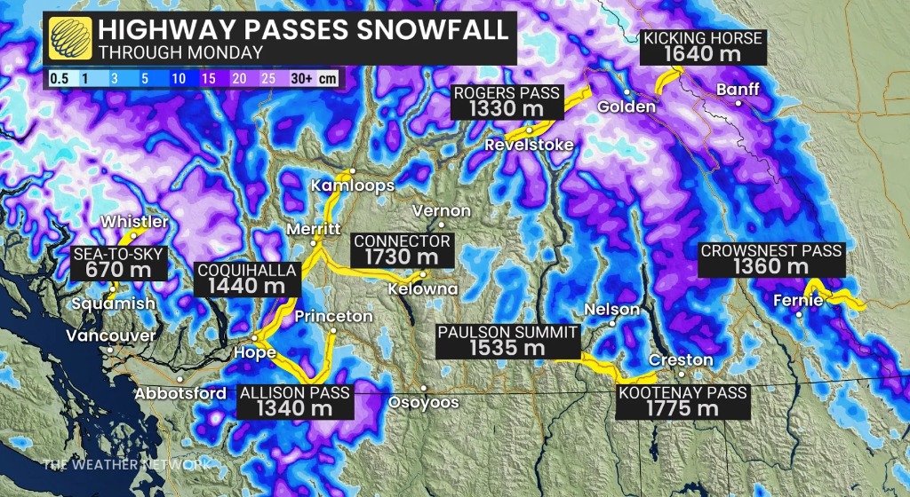 羅傑斯山口(Rogers Pass)和踢馬山口(Kicking Horse Pass)預計降雪超過 20 厘米,道路條件危險。低窪地區可能出現積水和積池,車輛需注意打滑風險。