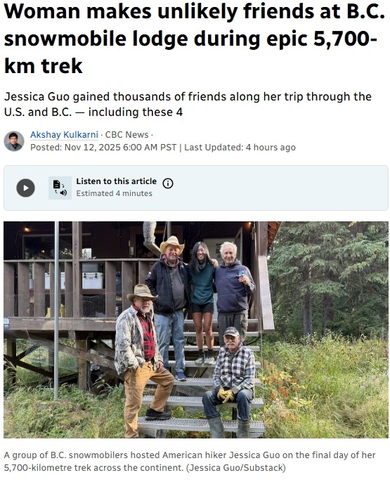 日期: 2025-11-12 | 来源: 加西网 | 有0人参与评论 | 字体: 小 中 大(加西网综合)美国一名华裔女子历时五个月,徒步5700公里穿越美国与加拿大,在旅程的最后一夜,意外从一群在小屋度假的BC省雪地摩托爱好者那里得到了温暖的帮助。