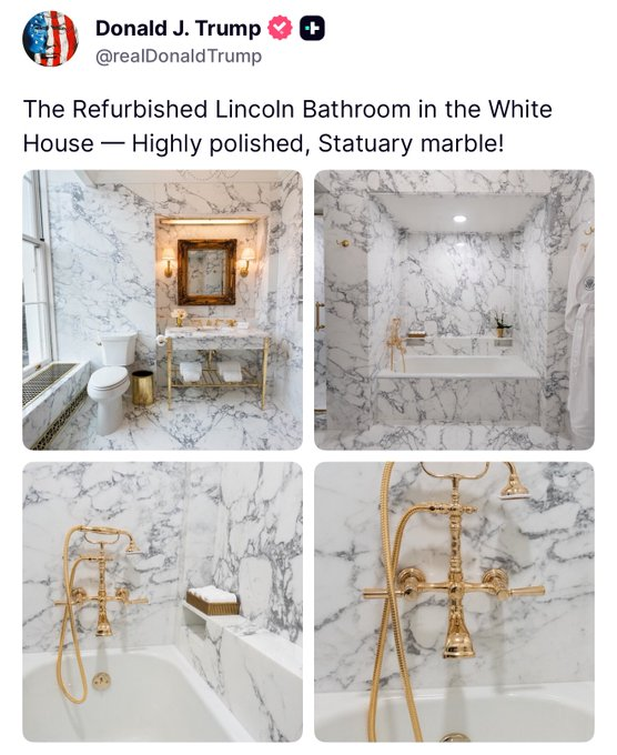 第二组画面由特朗普总统本人在社交媒体上发布,展示了他位于林肯卧室里重新装修的卫生间,金色五金件和大理石装饰熠熠生辉。