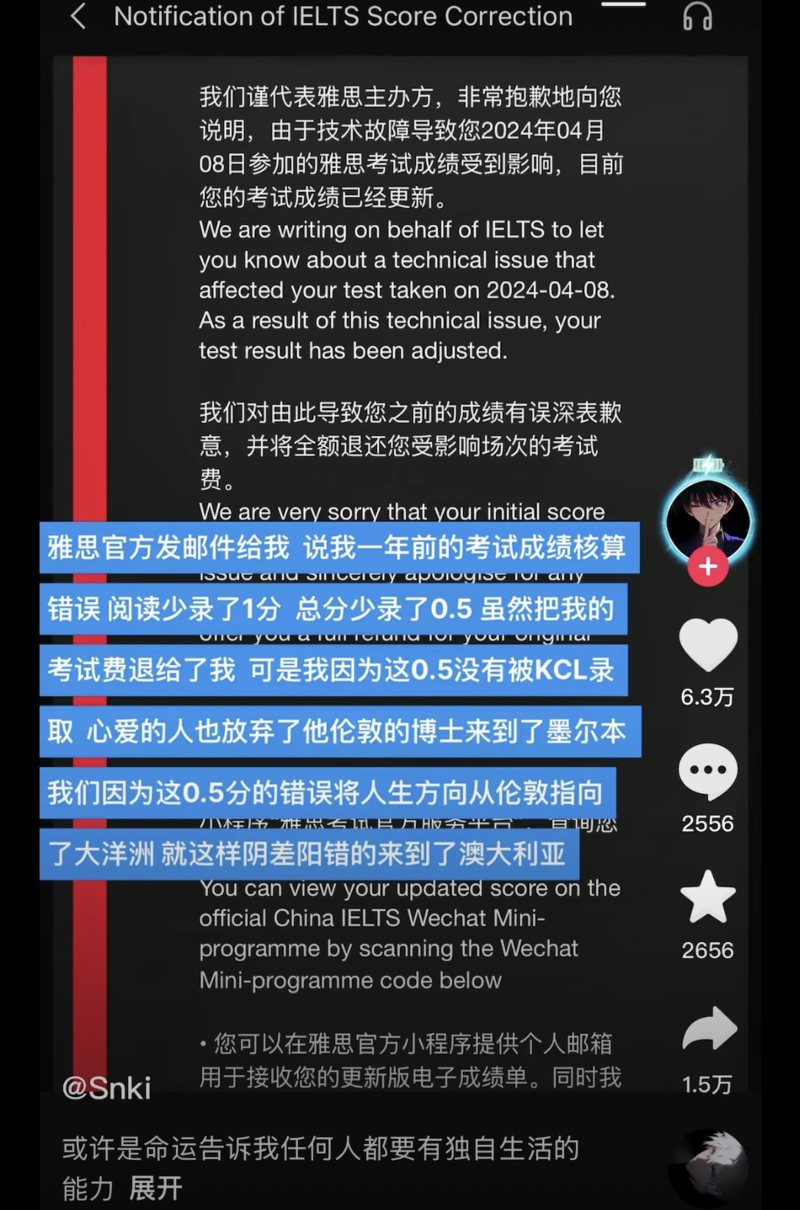 直到去年7月份,她才考出了目标分数,有惊无险地赶上秋季学期按时入学。而直到一周前,她才从雅思的邮件和官网中得知,原来她四月份第一次考试就已经达标了——只是因为所谓的“技术故障”导致成绩被压低了0.5分,于是她不得不又白费了最珍贵的三个月时间备考,在毕业季里把自己锁在家里学了很久。
