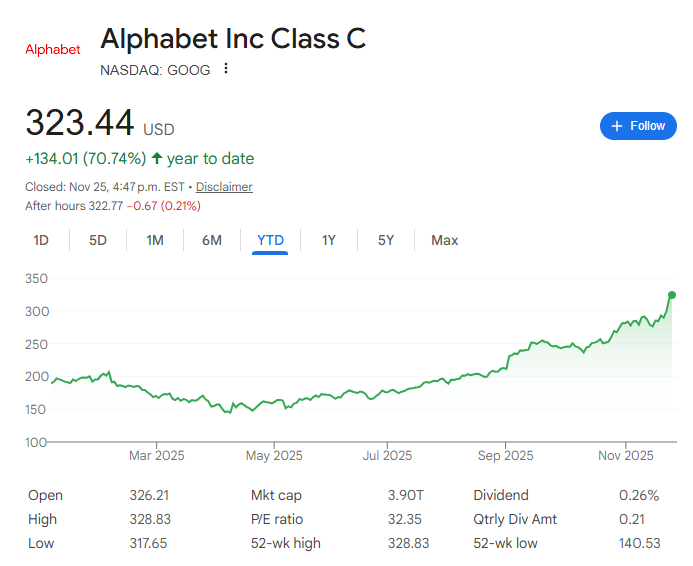 谷歌股價近日迎來強勁拉升,成為本周科技股反彈行情中最為耀眼的明星。周二(11月25日)美市盤中,Alphabet股價上漲1.53%,市值升至約3.9萬億美元,年內漲幅已逼近70%,並在過去六周單獨上漲35%,相當於短時間內增加了約1萬億美元市值。