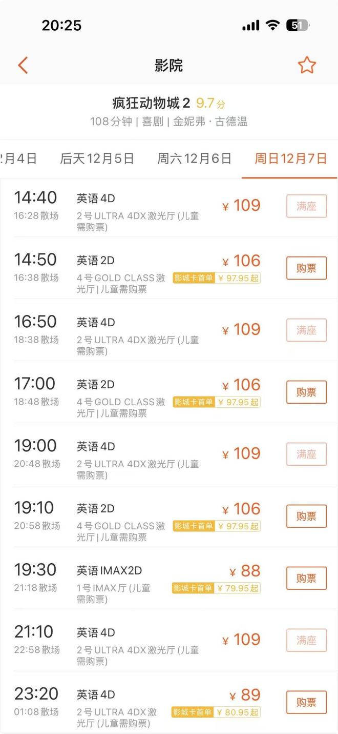 CGV影城(白玉兰广场IMAX店)12月7日仅剩深夜的4D场次可购票,其余时间段均已满座 网络截图