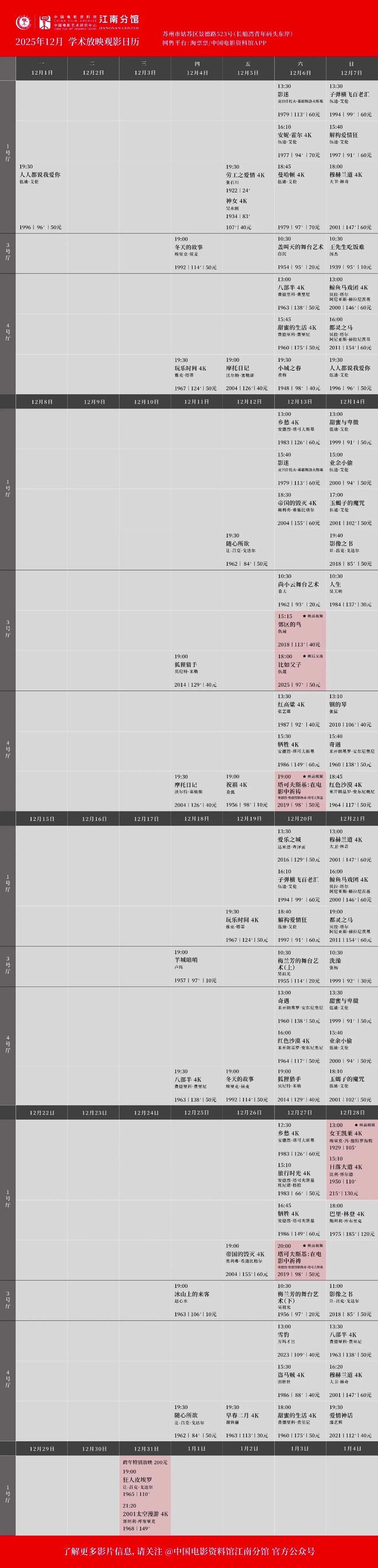12月江南分馆特别向大家推荐塔可夫斯基大师专题、“焦点影人:仇晟”、中国电影史名片精粹等众多重磅主题,等你来看。《八部半》《甜蜜的生活》《红色沙漠》《奇遇》四部名作版权即将到期,不再续约,最后放送。跨年放映已售罄,附赠精美大礼包,人手一份,敬请期待。