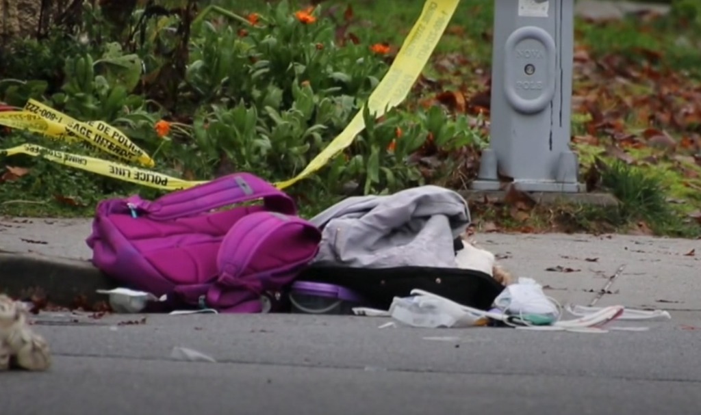 车祸事故发生后,路面上散落着一双童鞋、一个背包和其他一些物品。