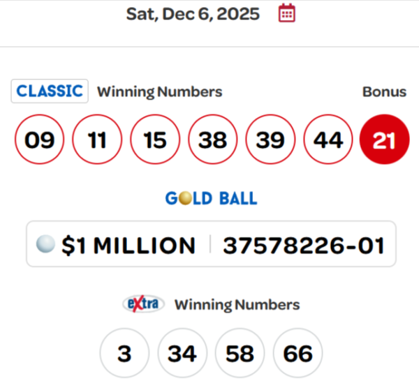 12月6日星期六開獎的Lotto 6/49彩球沒有被抽出,因此無人獲得高達3800萬的金球獎。