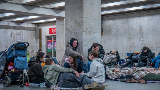2025 年 11 月 14 日清晨,乌克兰基辅被,在俄罗斯无人机的袭击期间,人们躲在用作防空洞的地铁站内寻求庇护。(美联社)