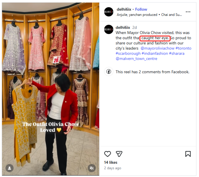 多伦多市长邹至蕙(Olivia Chow)最近没跳舞、没骑自行车、没修路……而是跑到士嘉堡一家小店当起了“带货主播”,高举印度礼服喊“买它!”