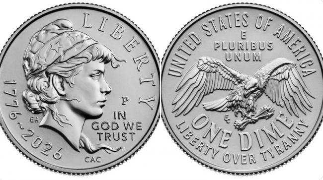 10美分硬币将展现自由女神像和1只雄鹰,代表美国争取独立的斗争。