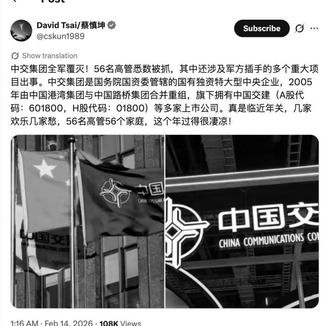 2月14日,海外知名自媒體人蔡慎坤先生在X平台爆料,“中交集團全軍覆滅!56名高管悉數被抓,其中還涉及軍方插手的多個重大項目出事。”