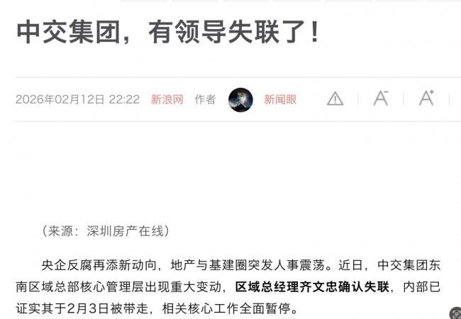 2月12日,大陸新浪網刊發一篇文章《中交集團,有領導失聯了!》。文章稱,據內部多位人士證實,中交集團東南區域總部核心管理層出現重大變動,區域總經理齊文忠確認失聯,內部已證實其於2月3日被帶走,相關核心工作全面暫停。