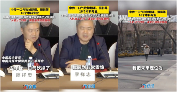 日期: 2026-03-09 | 来源: 新唐人 | 有0人参与评论 | 字体: 小 中 大中国传媒大学党委书记廖祥忠在中共两会期间,接受官媒采访时,介绍中国传媒大学本科专业调整,声称他砍掉了16专业,一口一个“我”字,网友批评,“学校像是他家的”,“权力任性的很”。