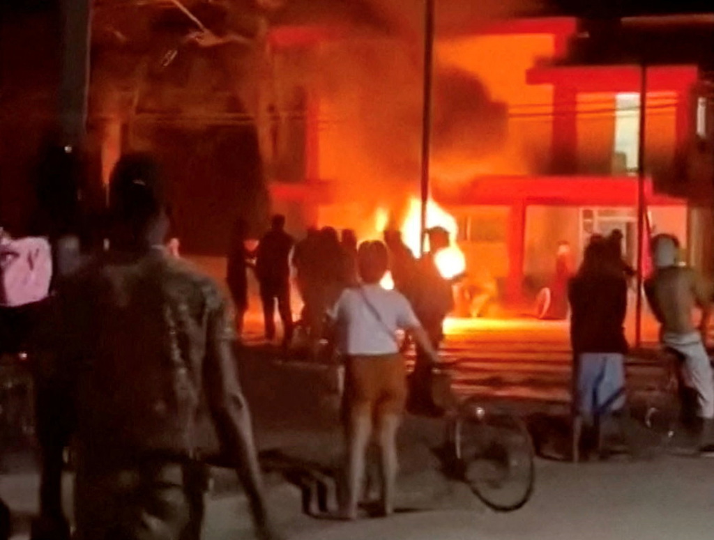 古巴中部城市莫龙(Morón),发生群众破坏了当地共产党的办公室,并放火焚烧的抗议事件。(图/路透)