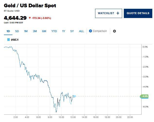 现货黄金现下跌3.6%,交投于4644美元/盎司一线,日内稍早一度下跌超6.5%至4502.58美元。