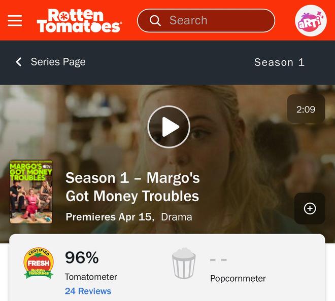 《MARGO'S GOT MONEY TROUBLES》定于4月15日在苹果电视(Apple TV)首播。按行业惯例,流媒体剧集往往在上线后逐步积累评分,提前获认证且分数逼近满分,说明试映口碑已经过一轮严格筛选。