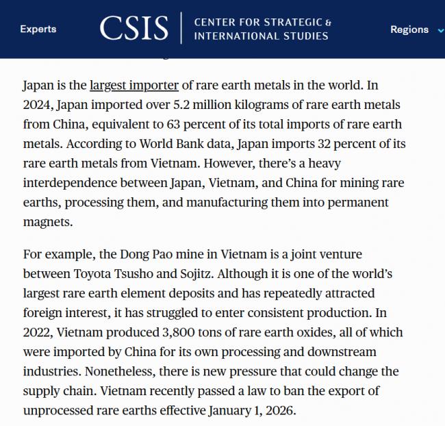 戰略與國際研究中心(CSIS)在《China’s Rare Earth Campaign Against Japan》報告中披露,日本早在2010年就啟動稀土供應鏈多元化戰略,通過海外投資大幅降低對中國依賴。日本是全球最大稀土金屬進口國,2024年從中國進口超5200噸,占其總進口63%,但越南占32%。因為日本已深度布局越南稀土供應鏈中下游。