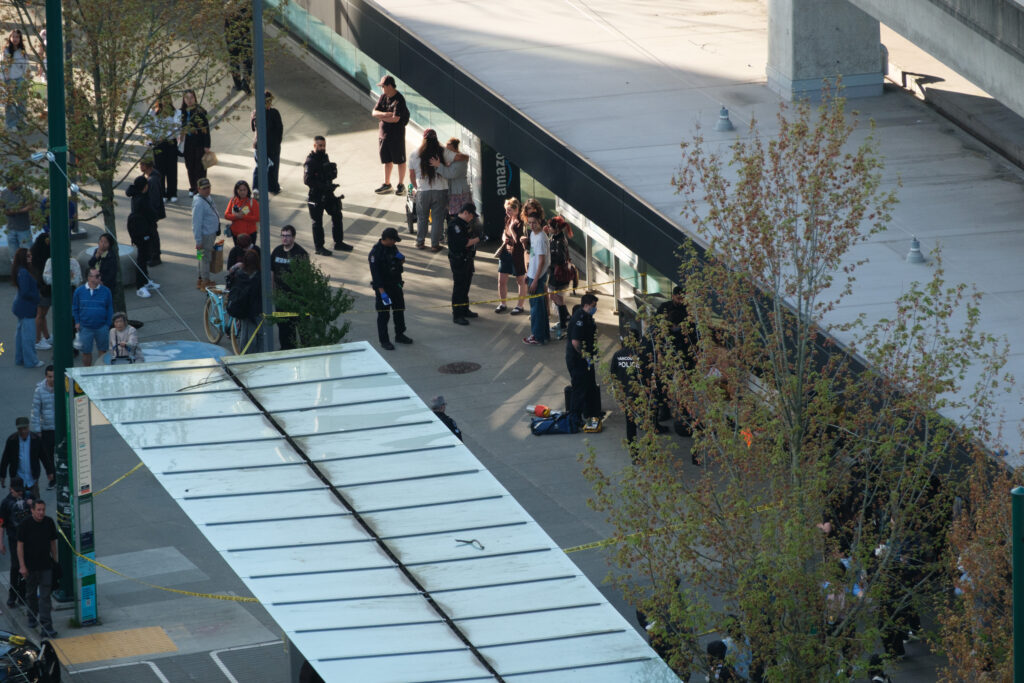 警察在車站外,靠近車站入口和開往UBC的R4路公交車候車區附近,拉起了警戒線。