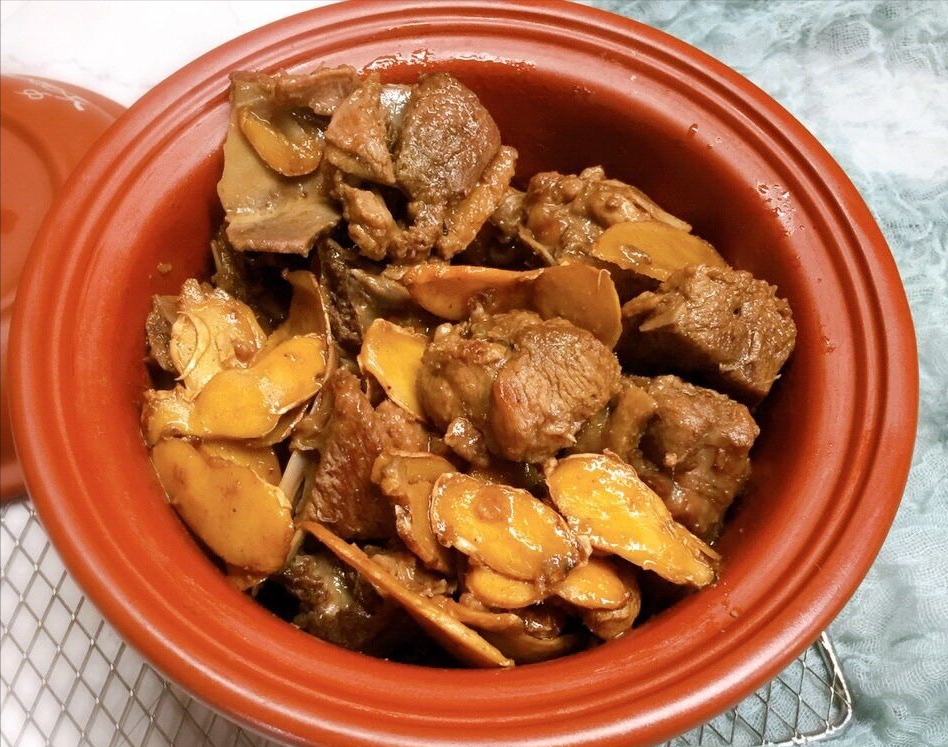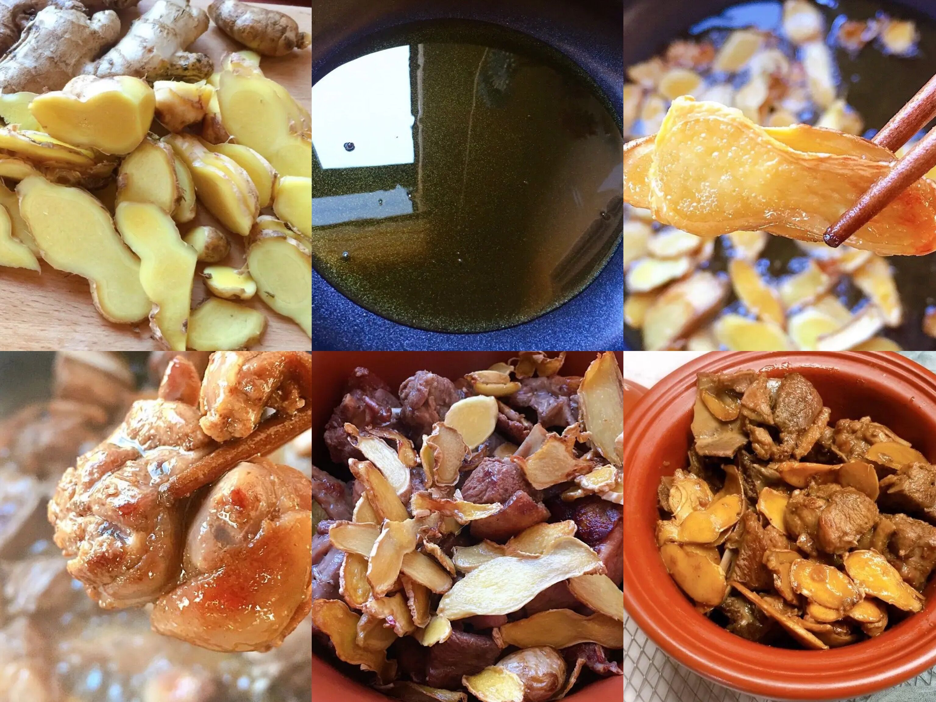 4、再把炒好的鸭肉放入砂锅中,加入姜片、米酒、盖锅小火慢焗2-3个小时,这样一道美味姜母鸭就做好了。