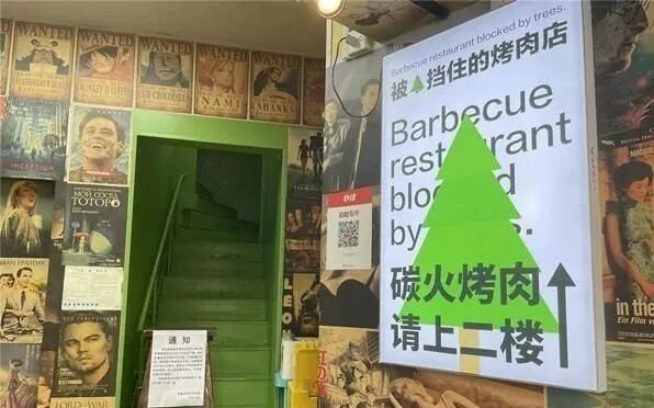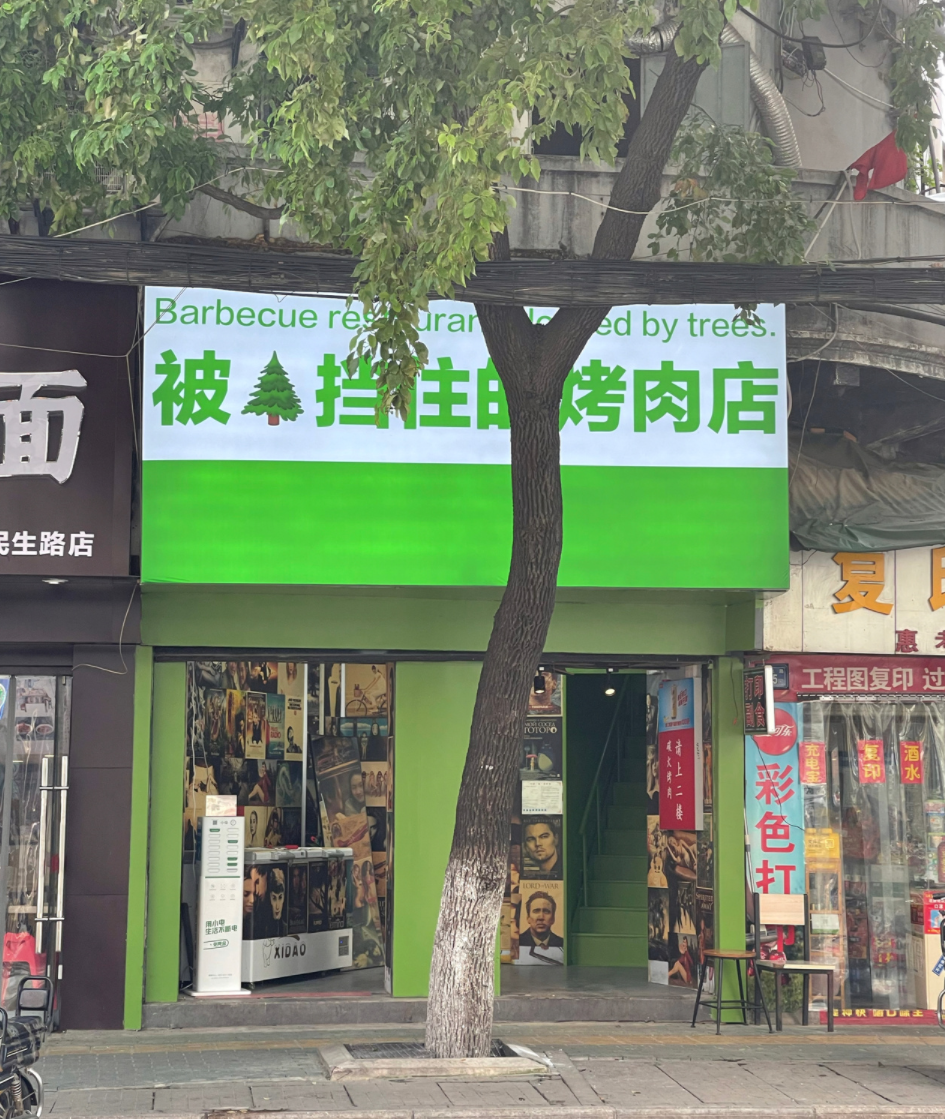 结果就是这么一句话让他来了灵感。秉承着“打不过就加入”的原则,被树挡住那不如就叫‘被树挡住的烤肉店’”。