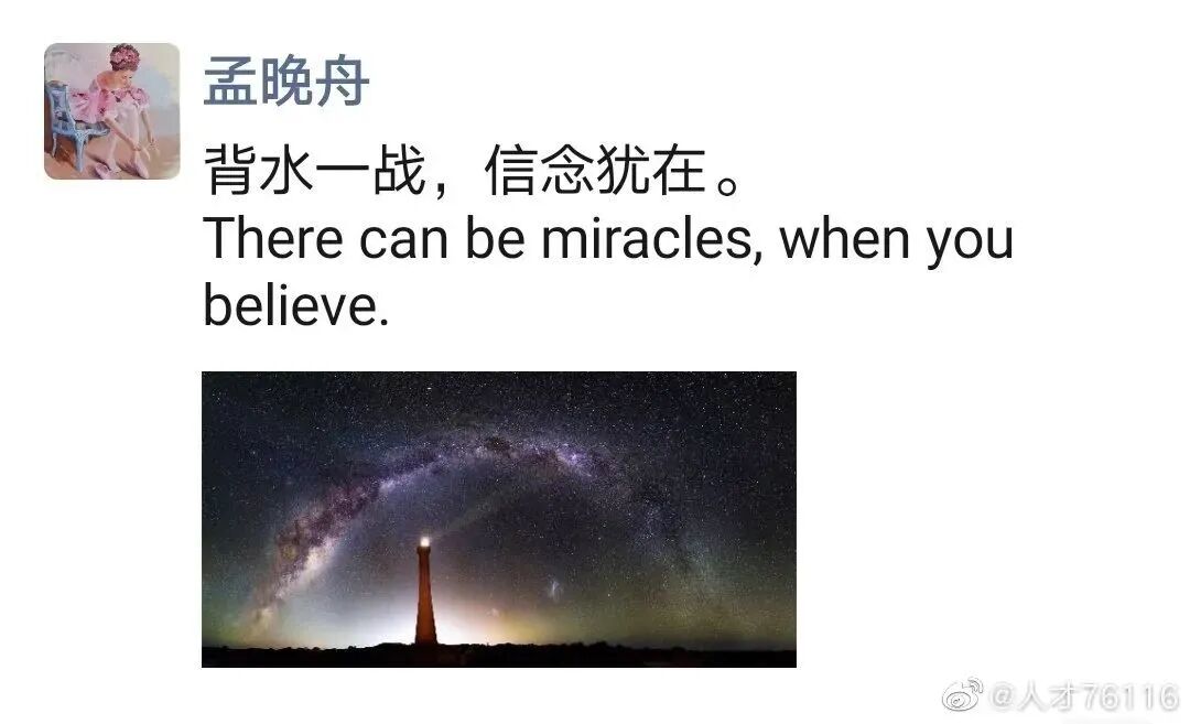 当孟晚舟在2018年第一次被保释后,在朋友圈发了条动态: