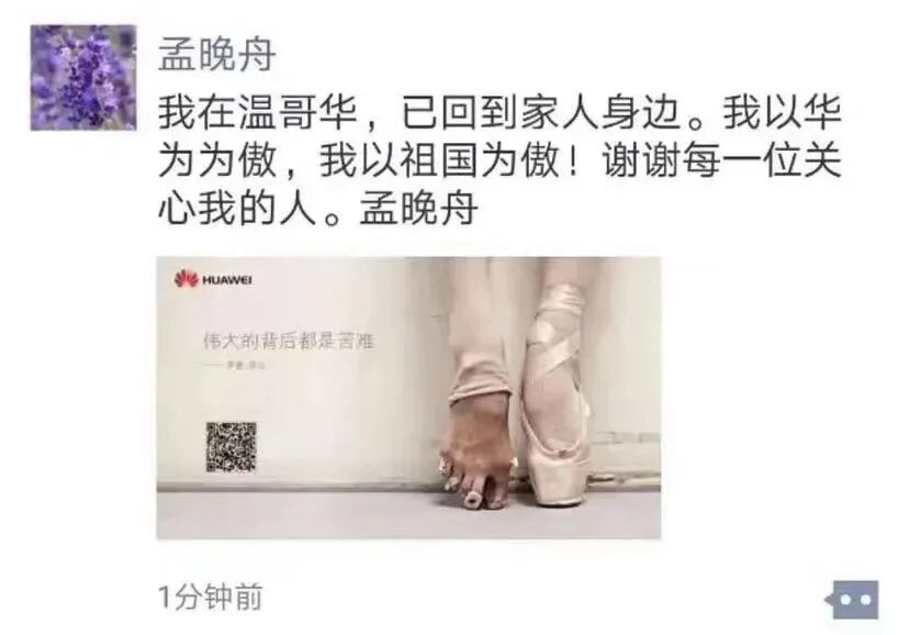 “我在温哥华,已回到家人身边。我以华为为傲,我以祖国为傲!谢谢每一位关心我的人!孟晚舟”