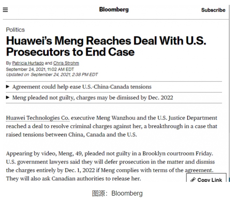 彭博社也发出消息:孟晚舟与美国司法部达成协议,结案。