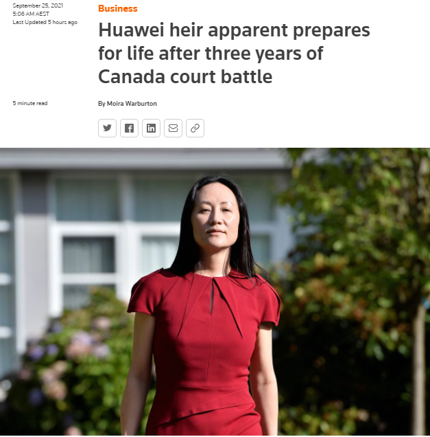 路透社报道:孟晚舟即将回国,并且配发了一张她面带自信、昂首阔步的照片。