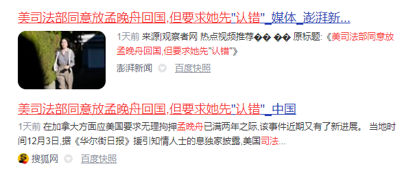 12月4日,对美方要求孟晚舟“认罪换自由”,
