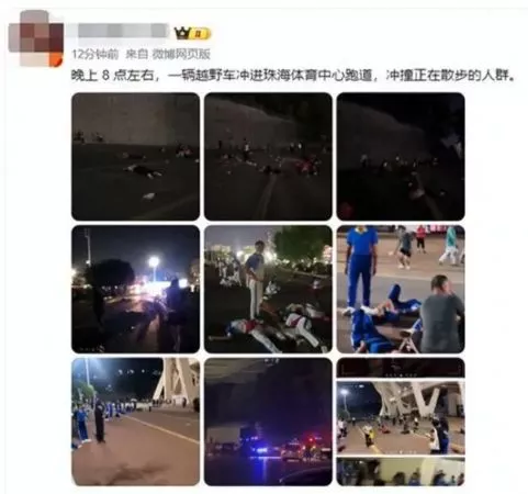 广东珠海一名62岁男子11日晚间开车闯入珠海体育中心,冲撞正在运动及散步的民众,当地警方已证实此事。警方尚未公布伤亡数,但据现场目击者透露,伤亡者多达数十人。