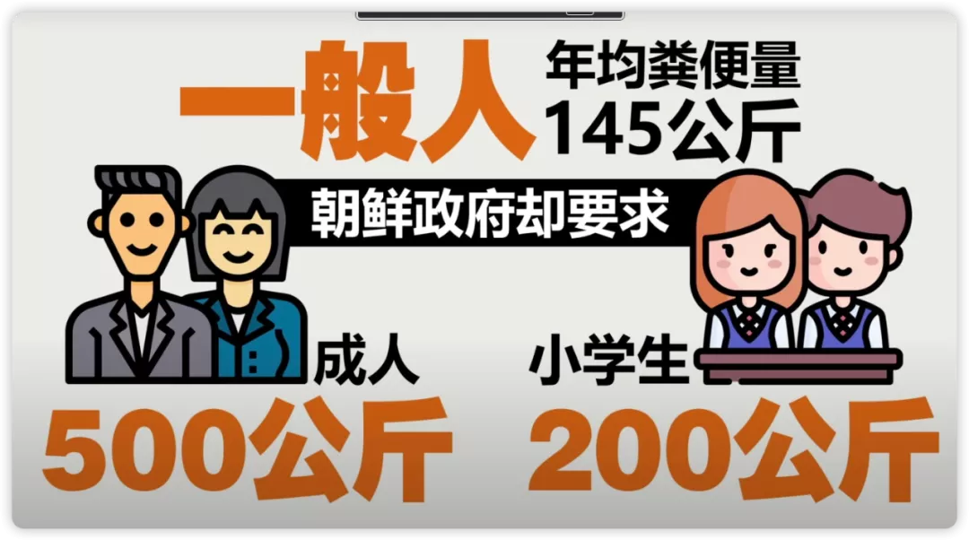 科學網站指出,一般人每年的糞便量平均是一百四十五公斤。但是朝鮮政府今年要求,成年人成人要一年五百公斤,小學生要一年兩百公斤。