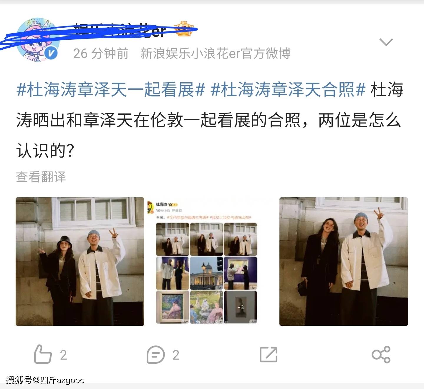 照片裡,杜海濤和企業家劉強東的夫人章澤天並肩合影,一起在英國倫敦看藝術展,氛圍慵懶愜意。