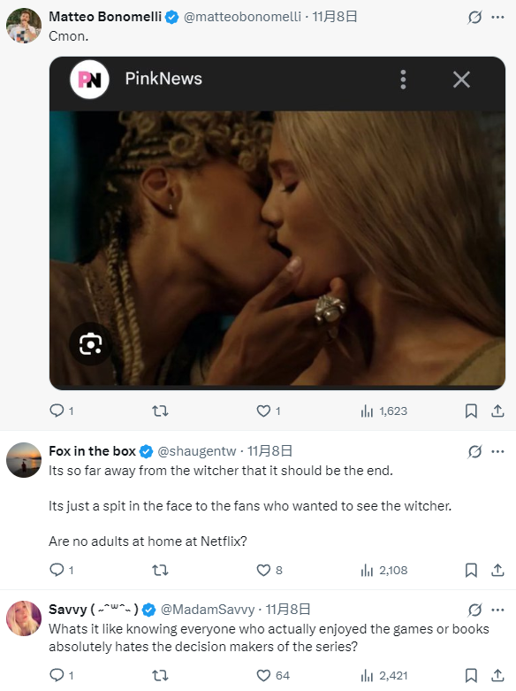 有网友表示:“《巫师》真人剧第四季一集比一集难看”“你们毁了原着,快点去死吧!”“与《巫师》原着相差甚远,是对粉丝们的极大侮辱”“这剧集已经没救了”