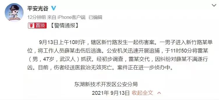 日期: 2021-09-13 | 来源: 新晚报 | 有0人参与评论 | 字体: 小 中 大事发武汉市东湖高新区新竹路。武汉市东湖新技术开发区公安分局发布通报:9月13日上午10时许,辖区新竹路发生一起伤害案。一男子进入新竹路某单位,将工作人员薛某击伤后逃逸。公安机关迅速开展追捕,于11时50分将雷某(男,47岁,武汉人)抓获。经初步调查,雷某交代,因纠纷对薛某不满遂行凶。目前,伤者经送医救治无效死亡。案件正在进一步侦办中。