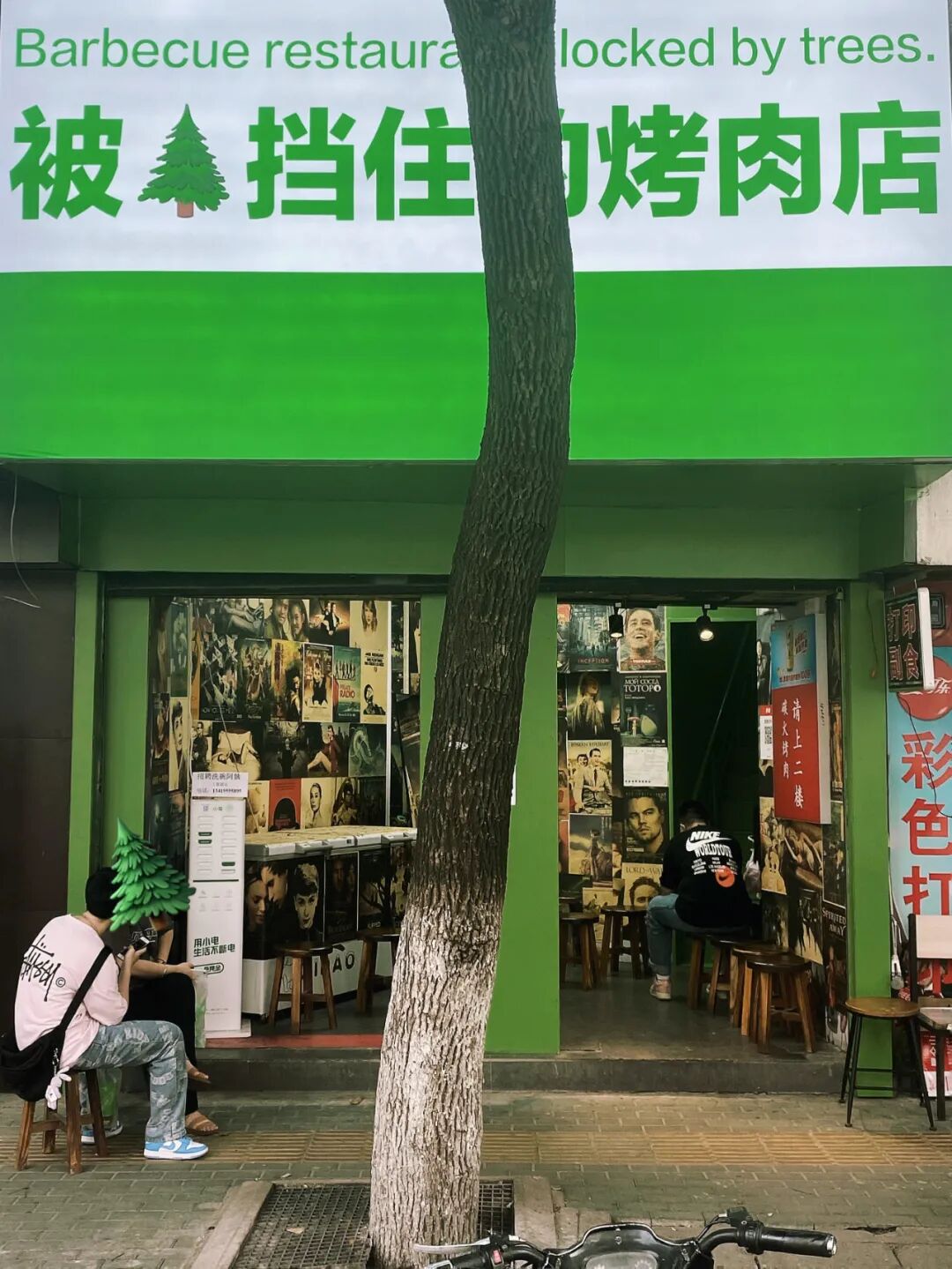 火的原因是,店铺的名字既可爱又奇葩,叫“被??挡住的烤肉店”,并且店铺本身真就被门前的一颗大树挡住了。