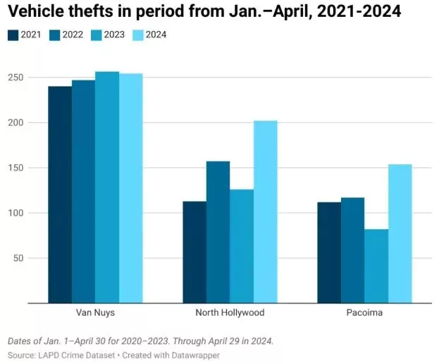 日期: 2024-05-15 | 来源: 大洛杉矶LA | 有0人参与评论 | 专栏: 加州 | 字体: 小 中 大一份最新的报告显示,今年以来洛杉矶的汽车盗窃案出现大幅升高的现象,尤其是圣费尔南多山谷,今年的汽车盗窃案数量创历史新高,比去年同期增加超过28%。