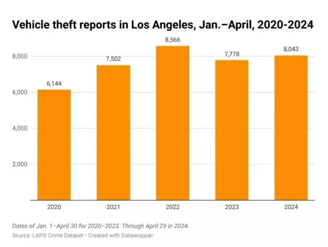 遭受损失的不仅仅是洛杉矶。根据美国国家保险犯罪局的数据,2023 年有超过 100 万辆汽车被盗,比上一年增加了 1%,加州是人口最多的州,盗窃案的数量也最高。
