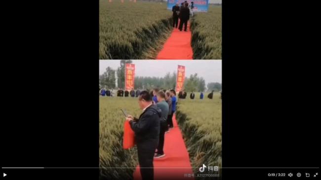 然而有网友发现,这些官员在田地内铺设红毯,并将周围的小麦给压塌了,有大量网民提出质疑。然而该公司却声称,红毯的正下方是农田中预留的小路,由于红毯略宽才导致两侧的小麦被压弯。