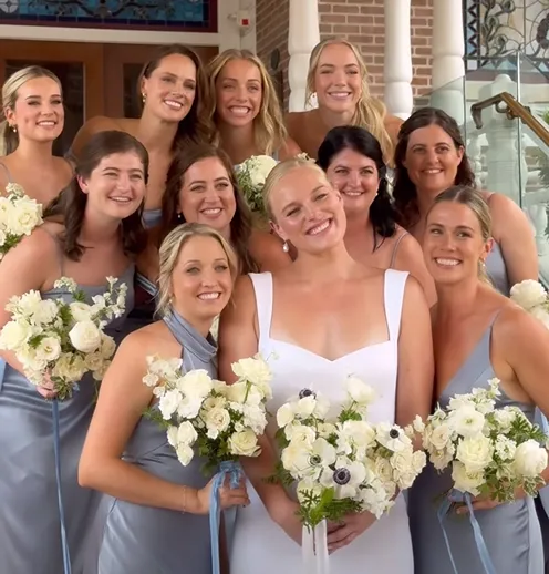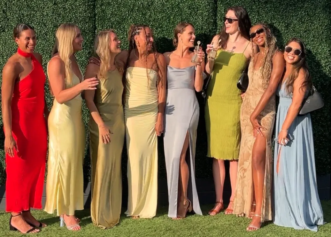 婚禮的開始,普拉默與她的閨蜜和隊友們一同慶祝這一刻,她們身著各式各樣的優雅長裙,從熱情的紅色到溫柔的淡藍色,每一位都以其獨特的風格增添了婚禮的色彩,這一瞬間不僅捕捉到了她們之間的歡聲笑語,也展示了她們對凱瑟琳大喜日子的喜悅與支持。