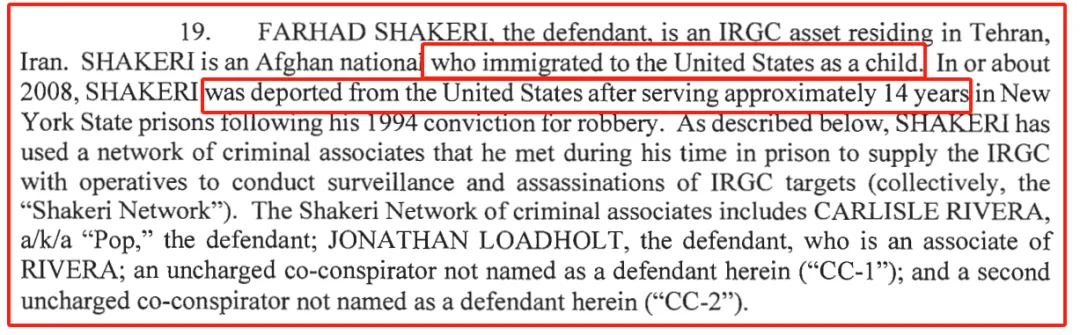 根据司法部起诉书的说法,1994年,沙克里因为犯下一级抢劫罪,被纽约州法院判处入狱服刑,直到2008年才出狱,出狱后被驱逐出境。