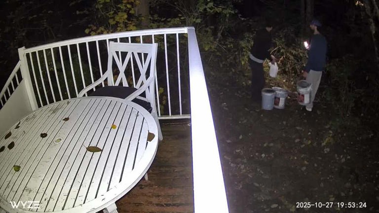 _NEWSDATE: 2025-10-30 | News by: 加西网 | 有0人参与评论 | _FONTSIZE: _FONT_SMALL _FONT_MEDIUM _FONT_LARGE(加西网综合)一名居住在穆迪港的居民在自家后院拍下监控视频,显示两名男子将五桶疑似油漆或其他建筑材料倒入诺恩溪(Noon's Creek),该溪流位于高贵林(Coquitlam)和波特穆迪交界处。
