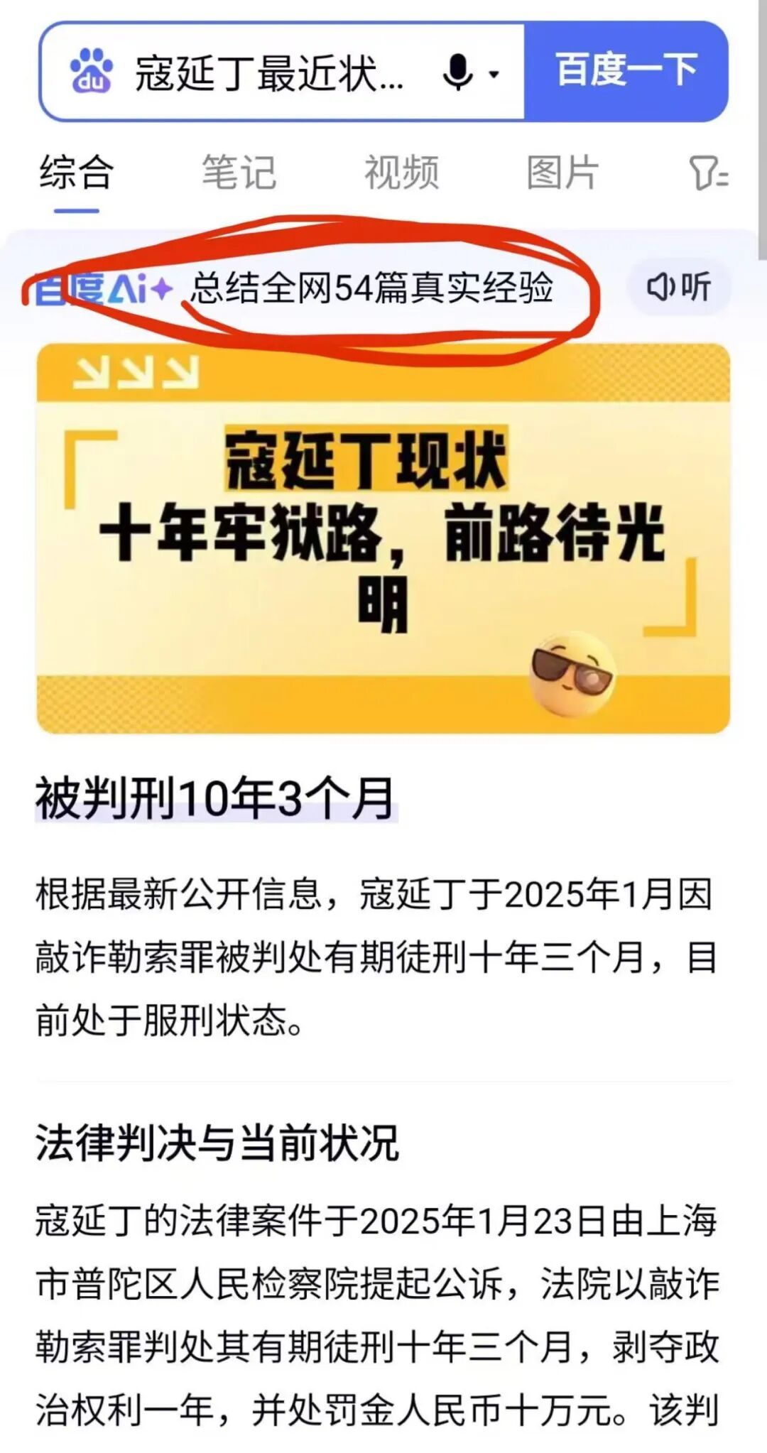 再仔细看看百度的谣言,原来,百度也知道判刑应该归法院,还煞有介事隆重推出了“上海市普陀区人民检察院提起公诉,法院以敲诈勒索罪判处其有期徒刑十年三个月…”检察院法院都被百度安排上了,这说明了啥?这个胆大包天的百度到底是不懂法呢?还是不在乎法?